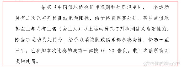 中国篮协新规加大了篮球兴奋剂的处罚力度,若一名球员两次阳性则终身禁赛,俱乐部三年内有三名球员阳性取消俱乐部参赛资格,收回之前所有奖项!